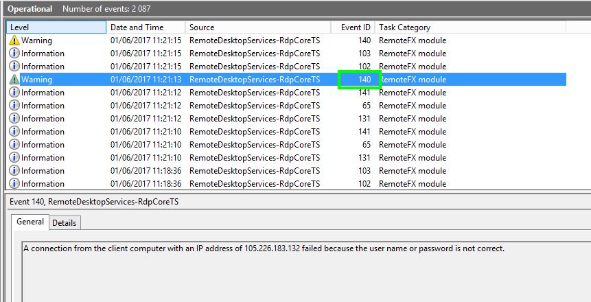 Mais si l’on regarde dans le journal Microsoft-Windows-RemoteDesktopServices-RdpCoreTS/Operational on retrouve un évènement 140 nous fournissant l’adresse du coupable.