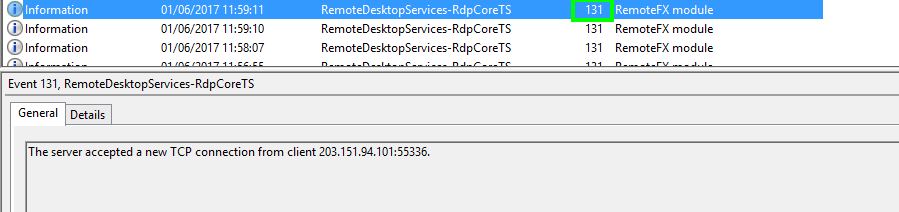 L’événement 131 du journal Microsoft-Windows-RemoteDesktopServices-RdpCoreTS/Operational qui signale une connexion: