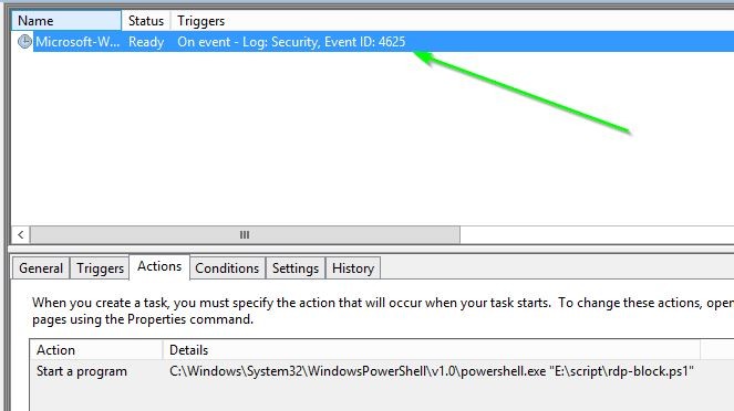 Il ne reste plus qu’a attacher l’exécution de ce script a l’évent 4625 au sein du Task Scheduler: