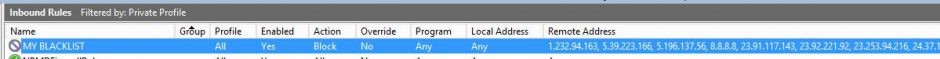 Vous avez bien créé la regle avec la commande New-NetFirewallRule -DisplayName “BLACK LIST” -Direction Inbound -LocalPort 3389 -Protocol TCP -RemoteAddress “8.8.8.8” -Action Block ??
