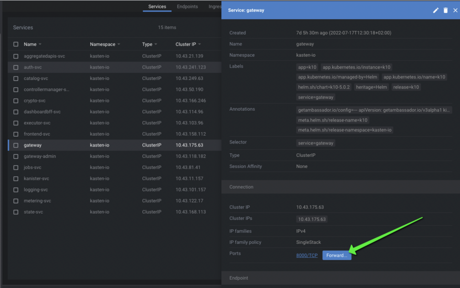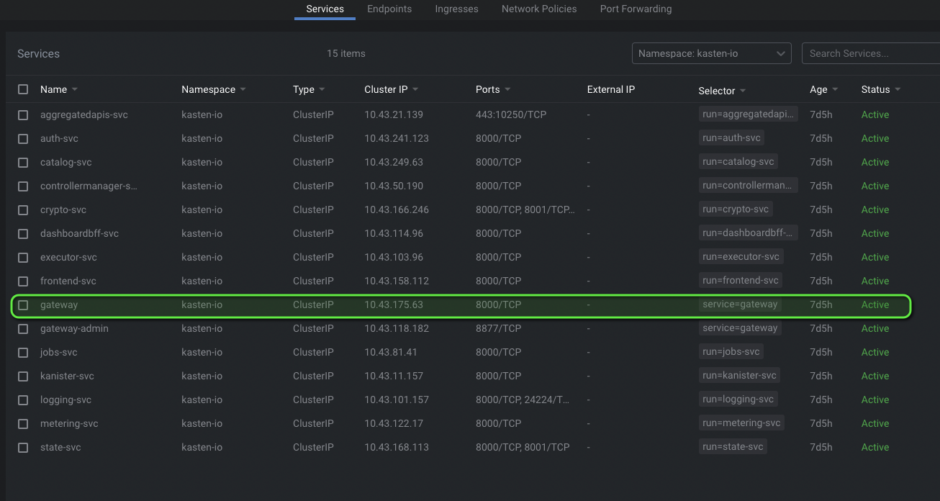 Une fois l’installation terminée (cela prends 2 a trois minutes), on se rend dans les services du name-space kasten-io pour chercher le service gateway: