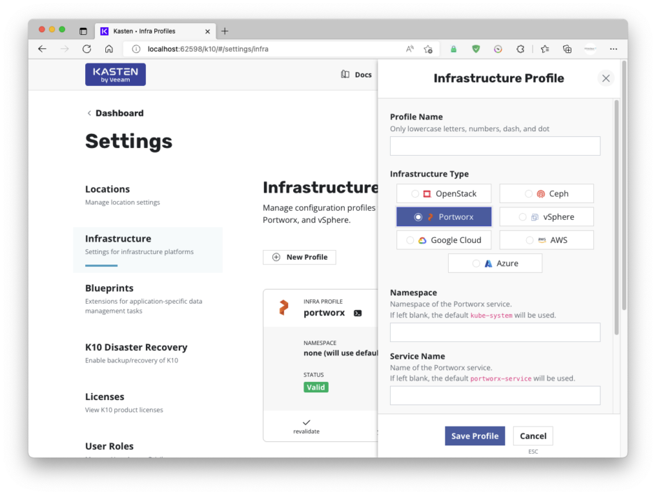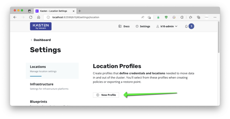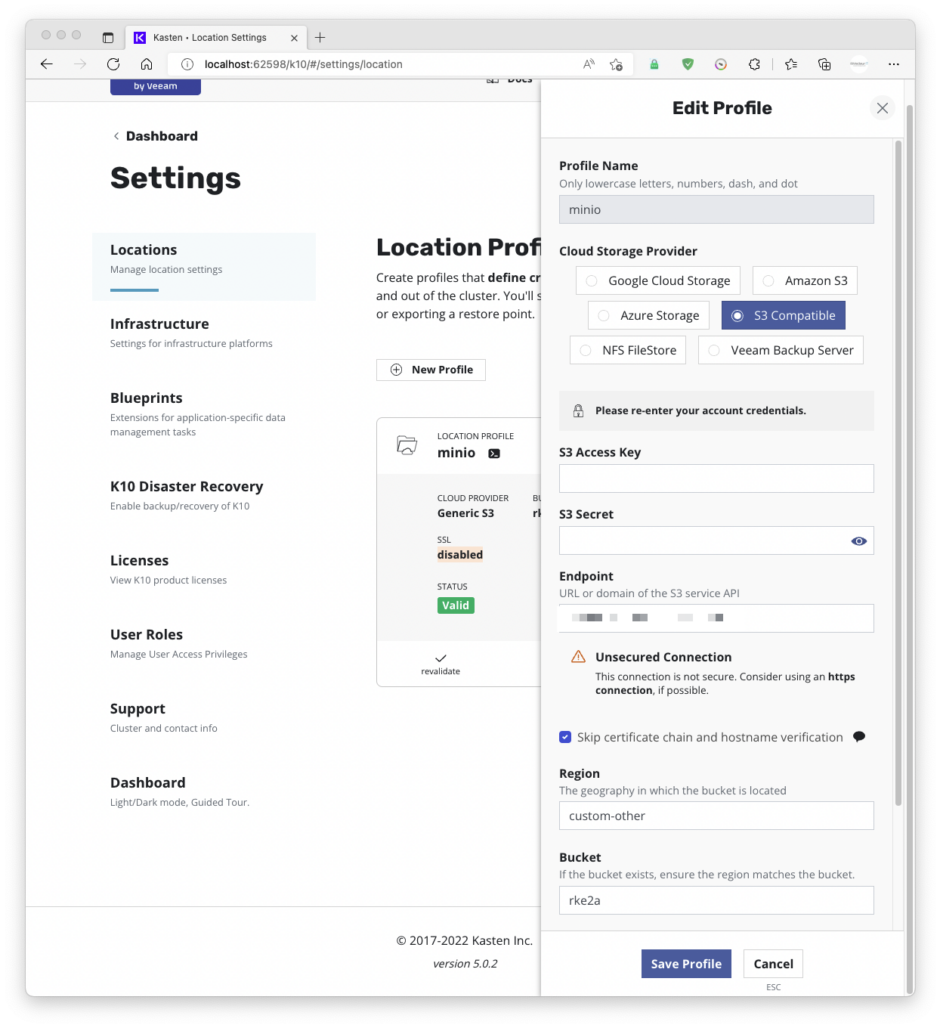 Dans Location, on créera un profil ou sont exportés les backups: Ce profil doit être exactement le même dans l’installation de kasten source et l’installation kasten de destination.