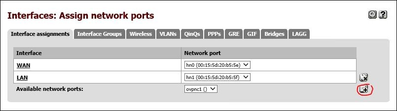 Ajouter l’interface du VPN précédemment créée en cliquant sur le “+”: