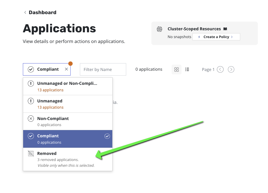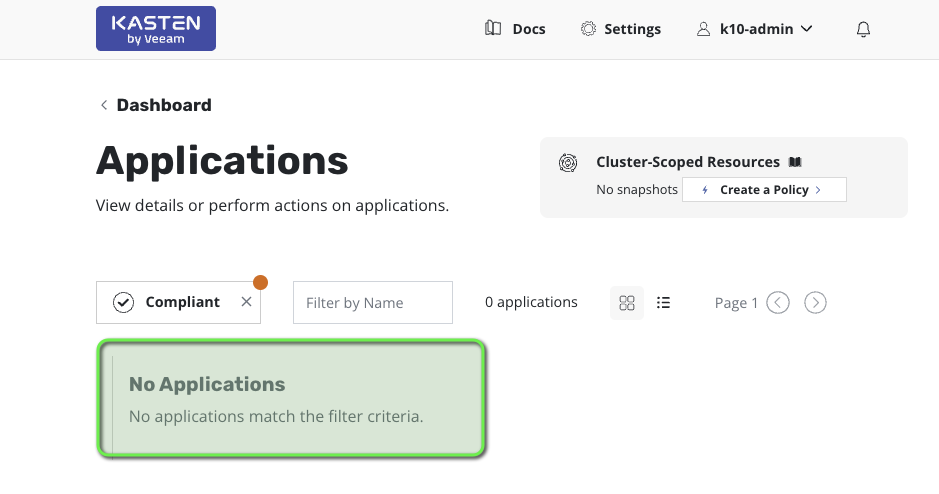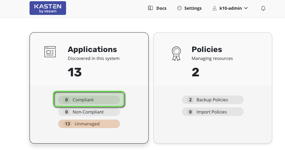 Les déploiements correctement sauvegardés apparaissent en vert dans la section compliant sur le portail Kasten: