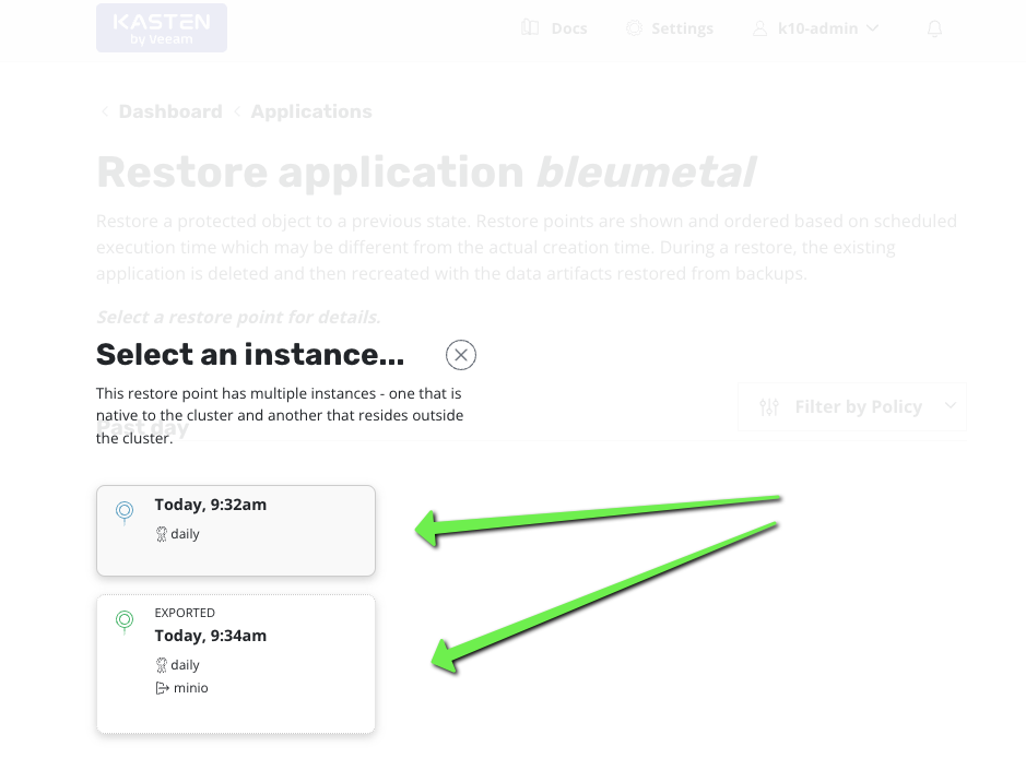 En cliquant sur restore, Kasten nous présente le snapshot local et l’export sur minio: