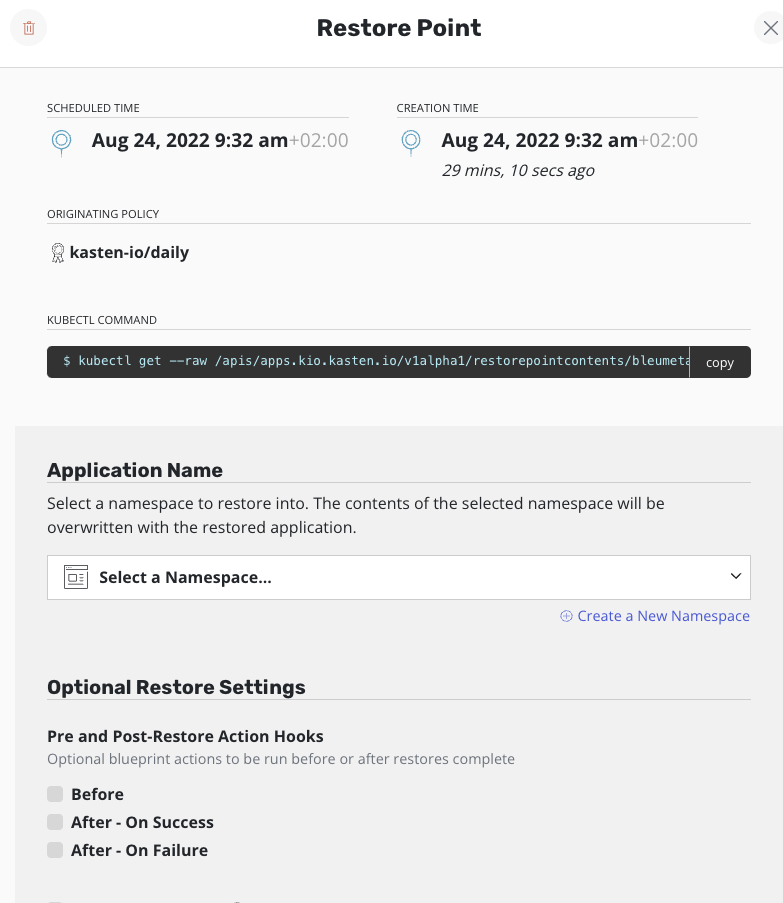 Si l’on ne spécifie aucun namespace, Kasten recréera le namespace d’origine.