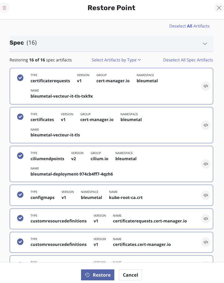 Vous pouvez aussi sélectionner plus bas les différents constituant (certificats, secrets,…) de l’application dans le cas d’une restauration granulaire (ce qui n’est pas mon cas):